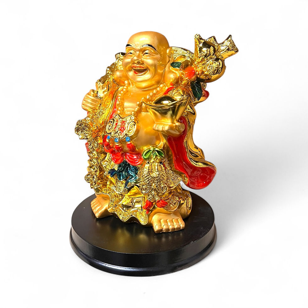 12” Golden Laughing Buddha on Dragon Turtle Statue with Wood Base